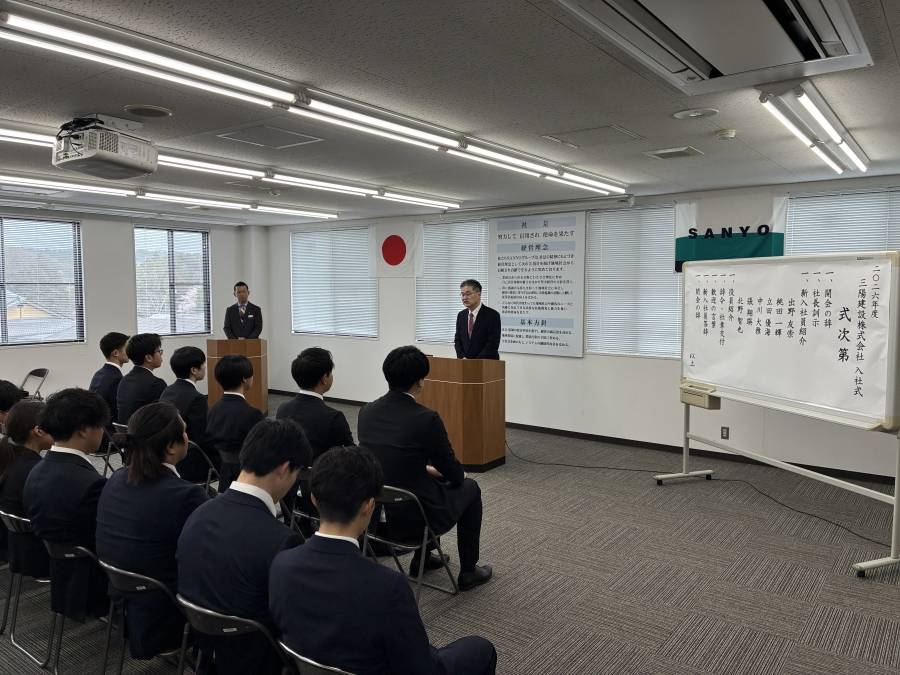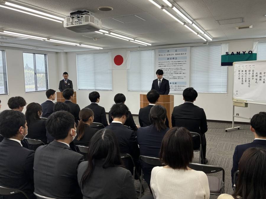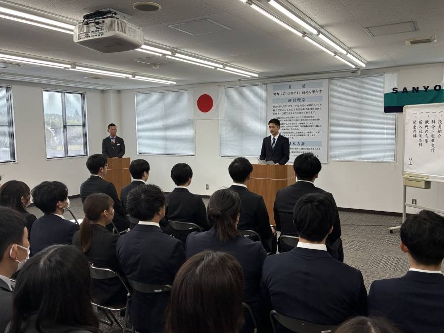 社長による訓示のあと、辞令・社章交付、若手社員からの歓迎の言葉、
